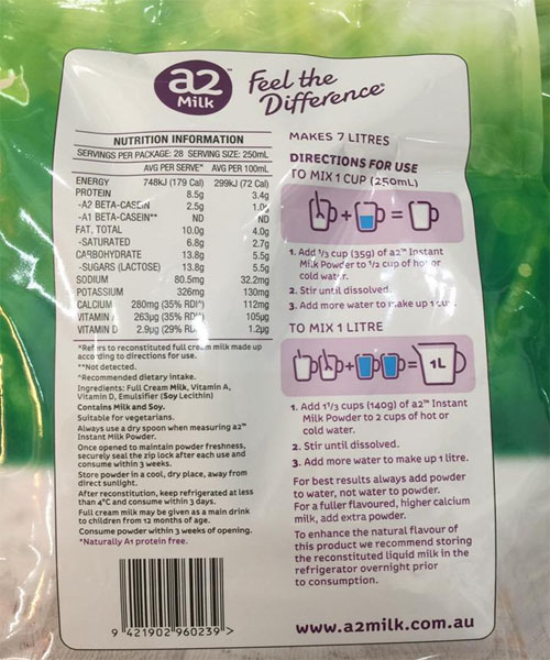 Sữa bột nguyên kem A2 tươi mới được sản xuất trên công nghệ tiên tiến mặc dù được sấy khô nhưng vẫn giữa lại tất cả các lợi ích tự nhiên có trong sữa thuần chủng A2. Sữa A2 nguyên kem có hàm lượng Canxi cao (HIGH IN CALCIUM), từ bò chỉ sản xuất Protein A2 và không có A1. Sản phẩm được đóng gói với công nghệ hiện đại theo tiêu chuẩn của Úc, đựng trong một túi kín khít để duy trì độ tươi và giúp sử dụng tiện lợi tại nhà cũng như khi di chuyển. 1 gói 1kg – tương đương với 7 lít sữa.