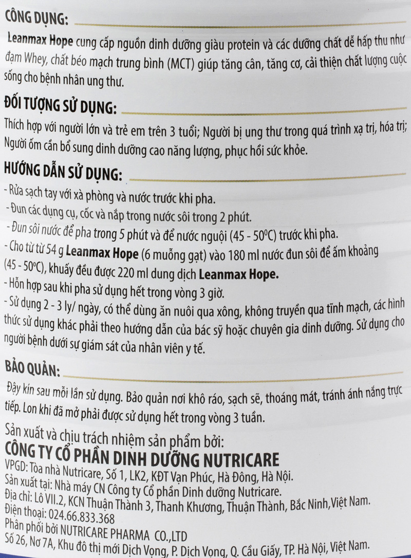 Sữa Lean Max Hope là sản phẩm dinh dưỡng y học dành cho người ung thư, cung cấp nguồn Protein và các dưỡng chất dễ hấp thu như đạm Whey, chất béo mạch trung bình(MCT) giúp tăng cân, tăng cơ, cải thiện chất lượng cuộc sống cho người ung thư.