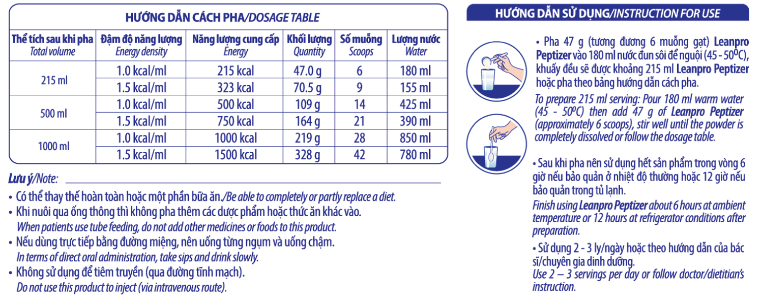 - Rửa tay và tiệt trùng dụng cụ pha chế thật sạch trước khi pha. Cho 47g( tương đương 6 muỗng gạt) LeanPro Peptizer vào 180ml nước đun sôi để nguội khoảng 45-50 độ khuấy đều sẽ được khoảng 215ml sữa