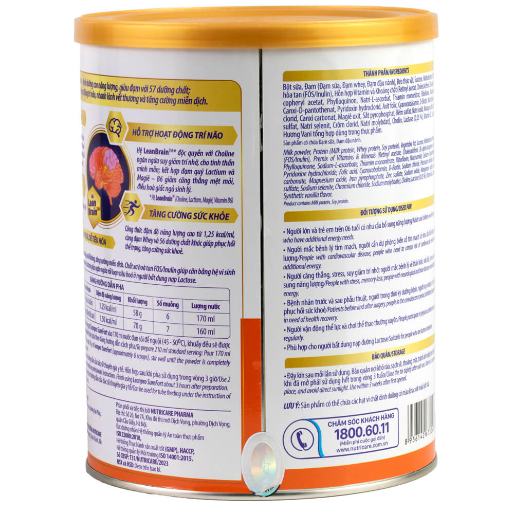 Sữa Leanpro Surefort 850g của thương hiệu NutriCare- Dinh dưỡng cao năng lượng, giàu đạm với 57 dưỡng chất, với hệ Leanbrain được phát triển đặc biệt giúp hỗ trợ hoạt động trí não, tốt cho tim mạch, nhanh lành vết thương và tăng cường hệ miễn dịch.