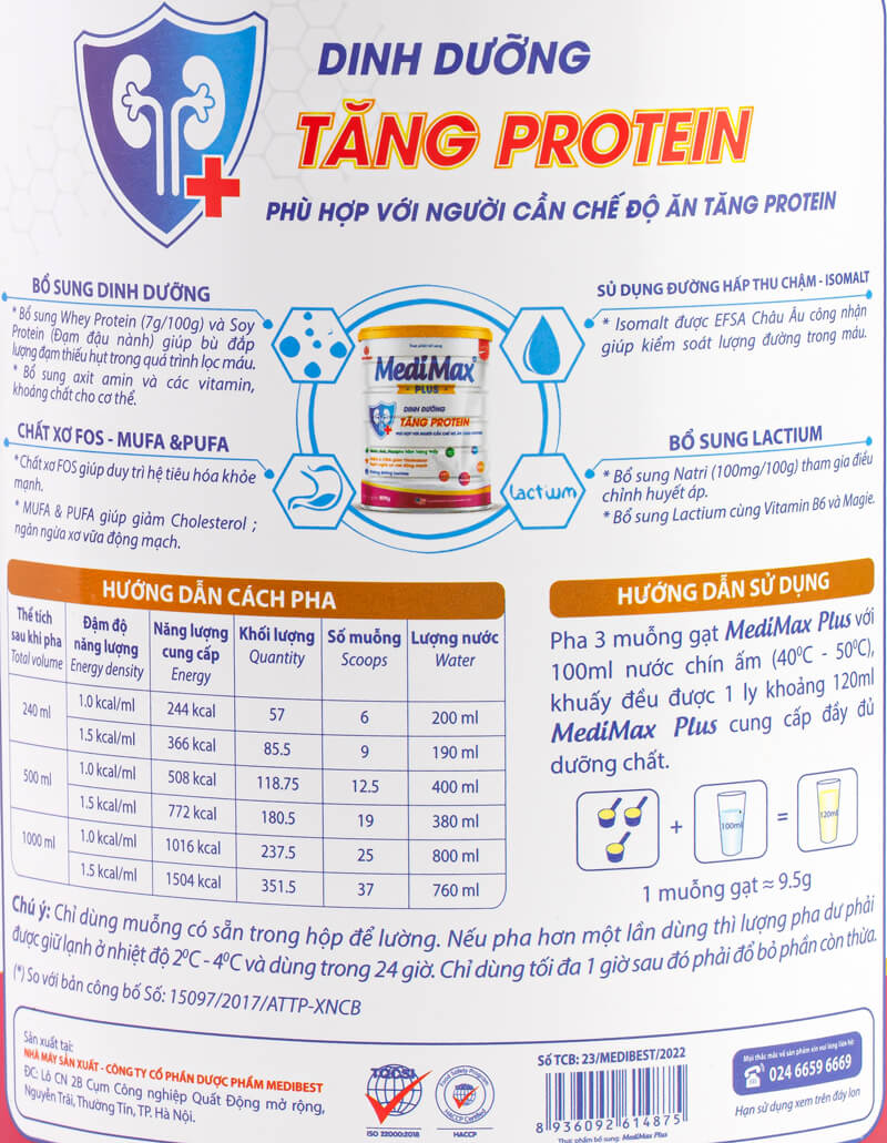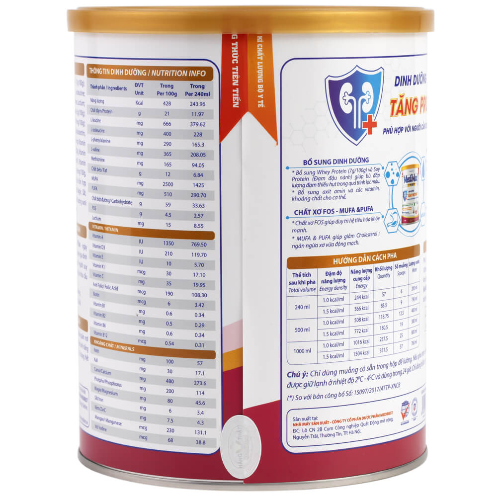 - Sữa MediMax Plus bổ sung 20g đạm/ 100g sữa bột